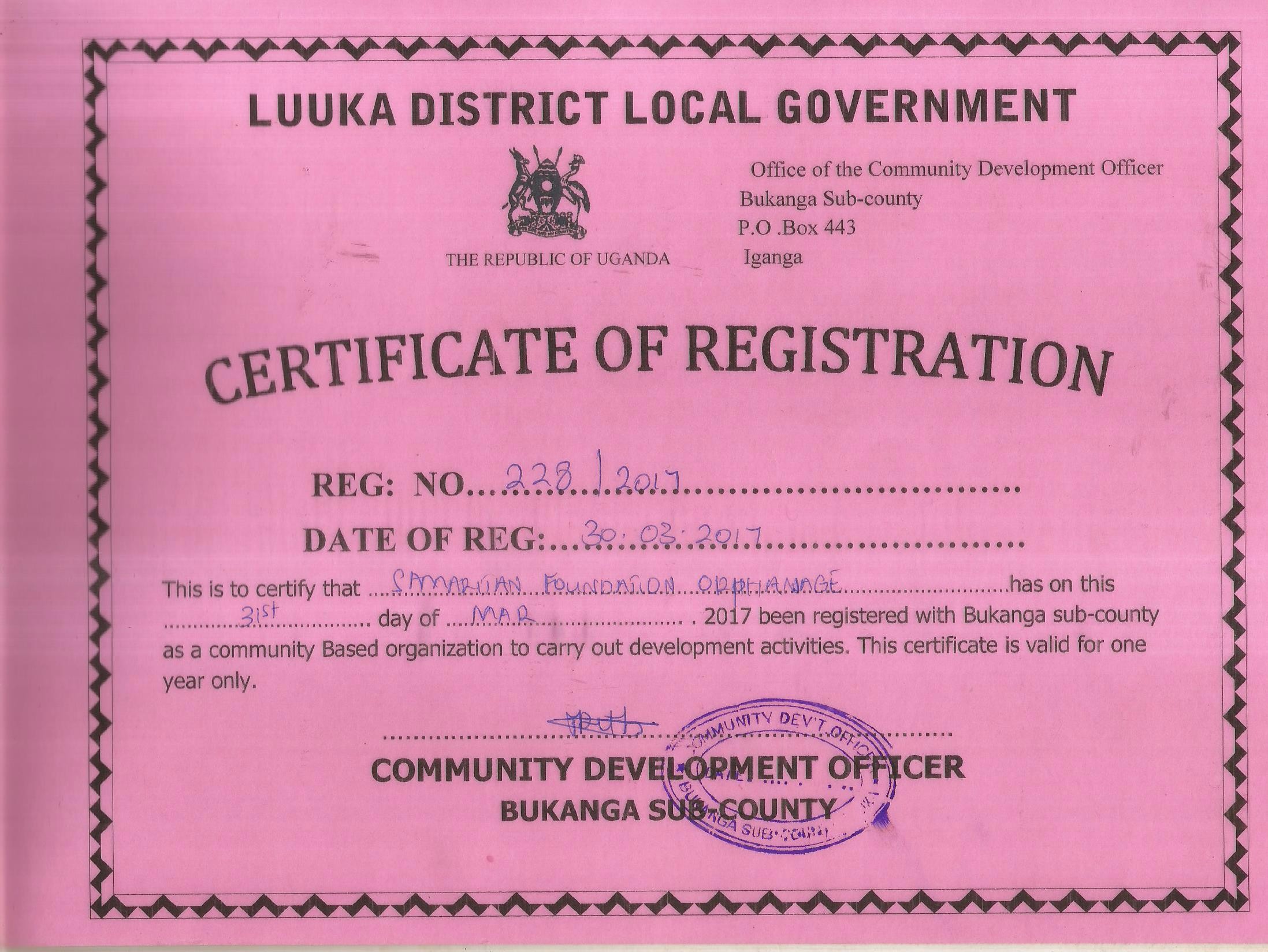 Registration Samaritan Foundation Orphanage