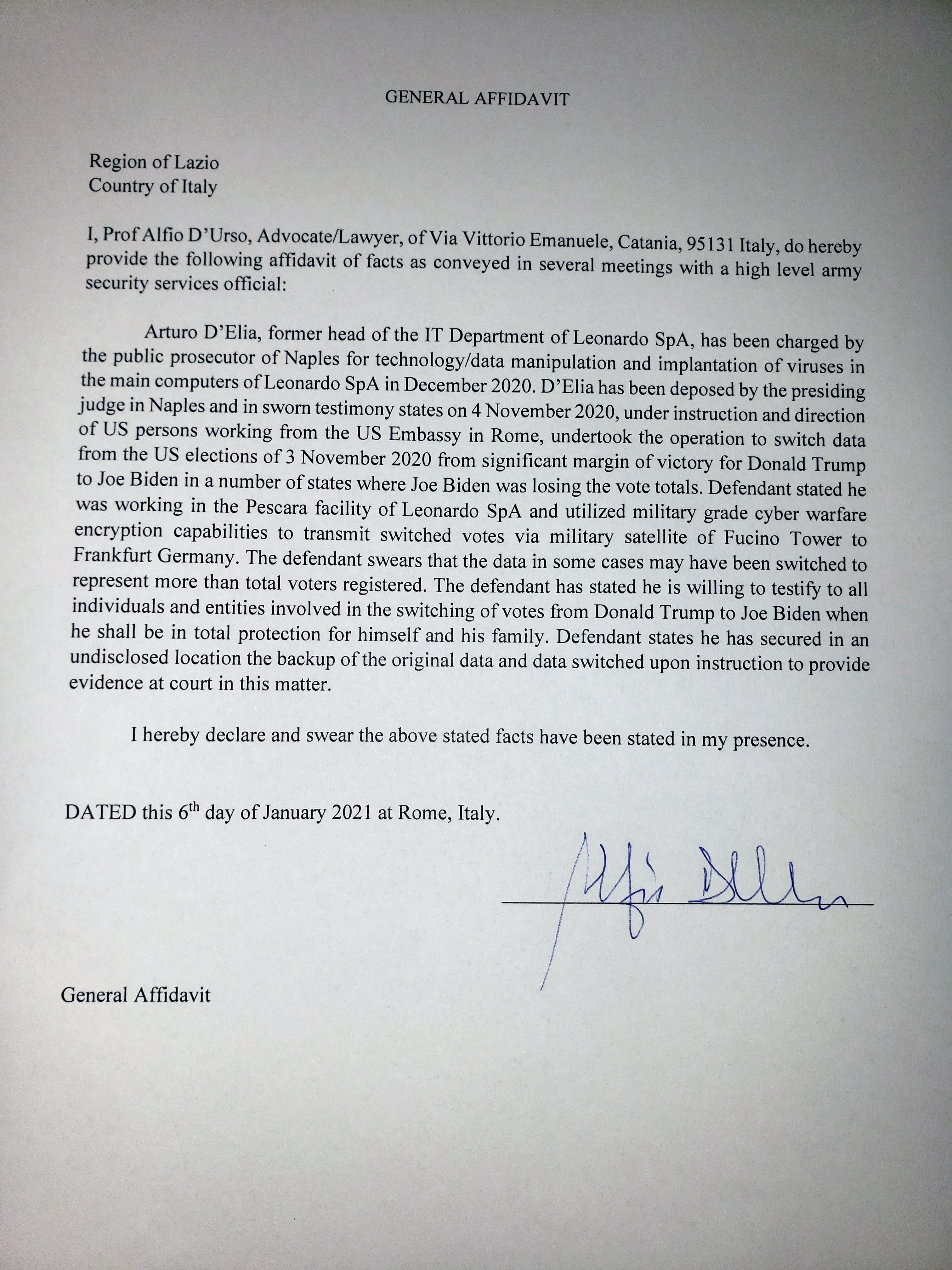 Affidavit Arturo D'Elia former head of the IT department of Leonardo SpA Pescara Facility