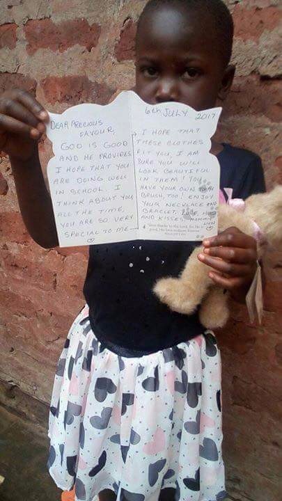 She is called Favour, she is sponsored and adopted from afar by dearest Lyn Sewert from USA, she is schooling and happy to be cared for by her adoptee mom.