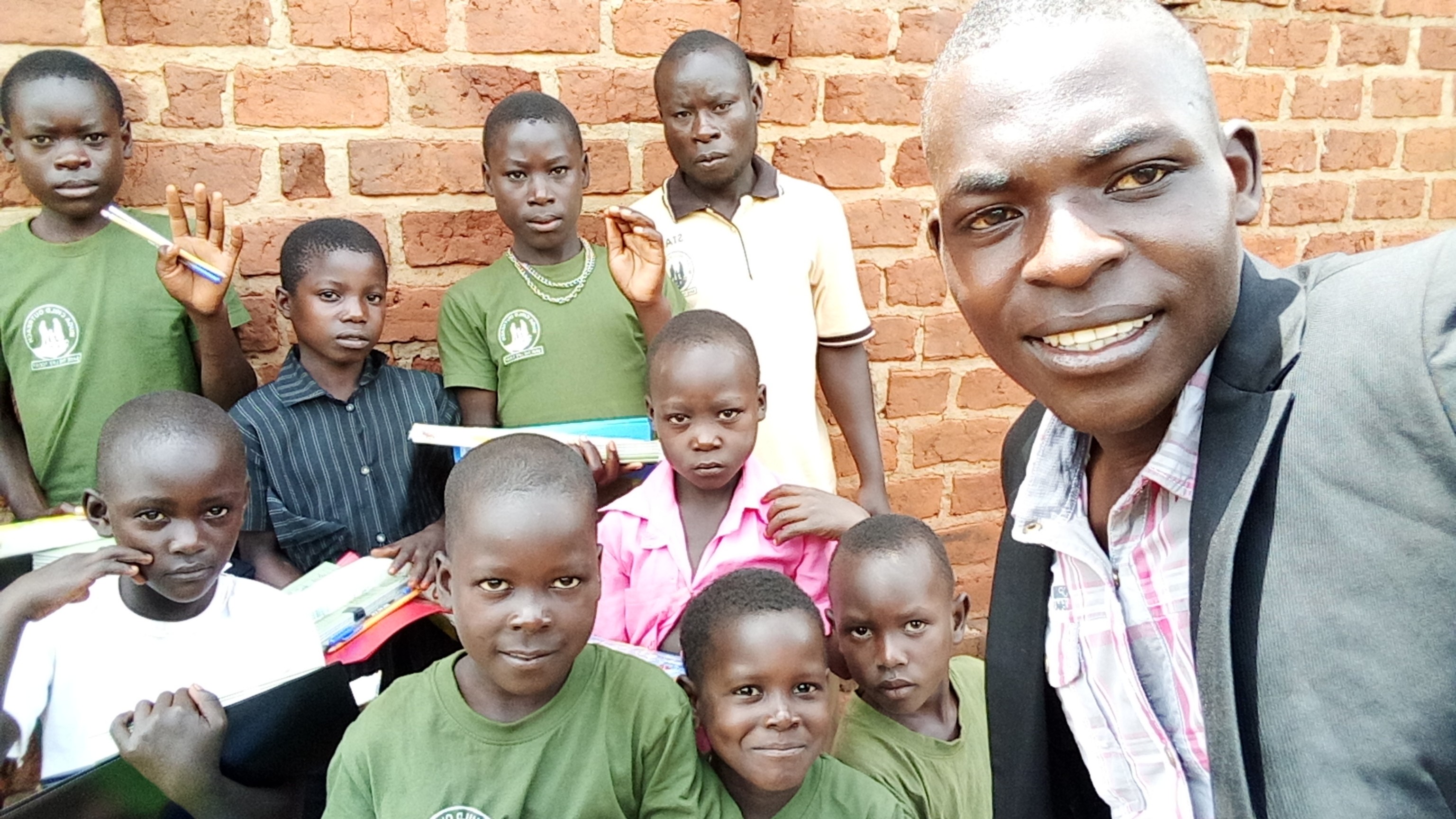 Fred, myself and the children taking selfies after receiving the gifts
