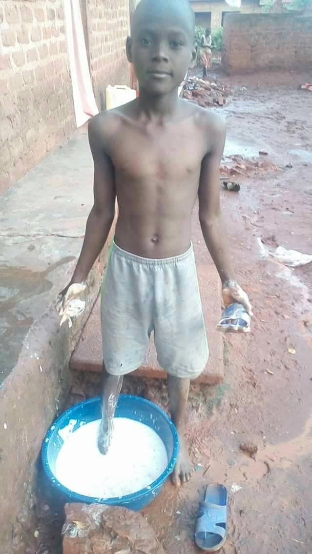 Sekanyo Rahim preparing to go for bathing, trying to first wash his shoes and legs.