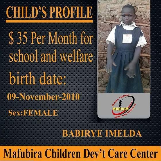 Babirye Imelda is a twin and was born on the 9th November 2010 to Daudi Mugenyi and Kisakye Maureen in a dysfunctional family where her mother left after continued marital fights and got married to another man.