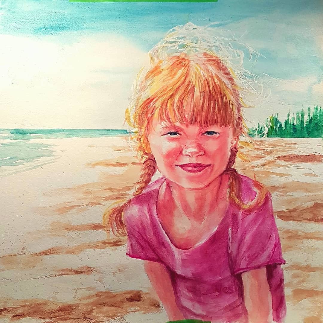 Here is finished watercolor in all her beach baby glory. I like the way the seascape horizon cuts across her eyes emphasizing her inquisitive eyes.