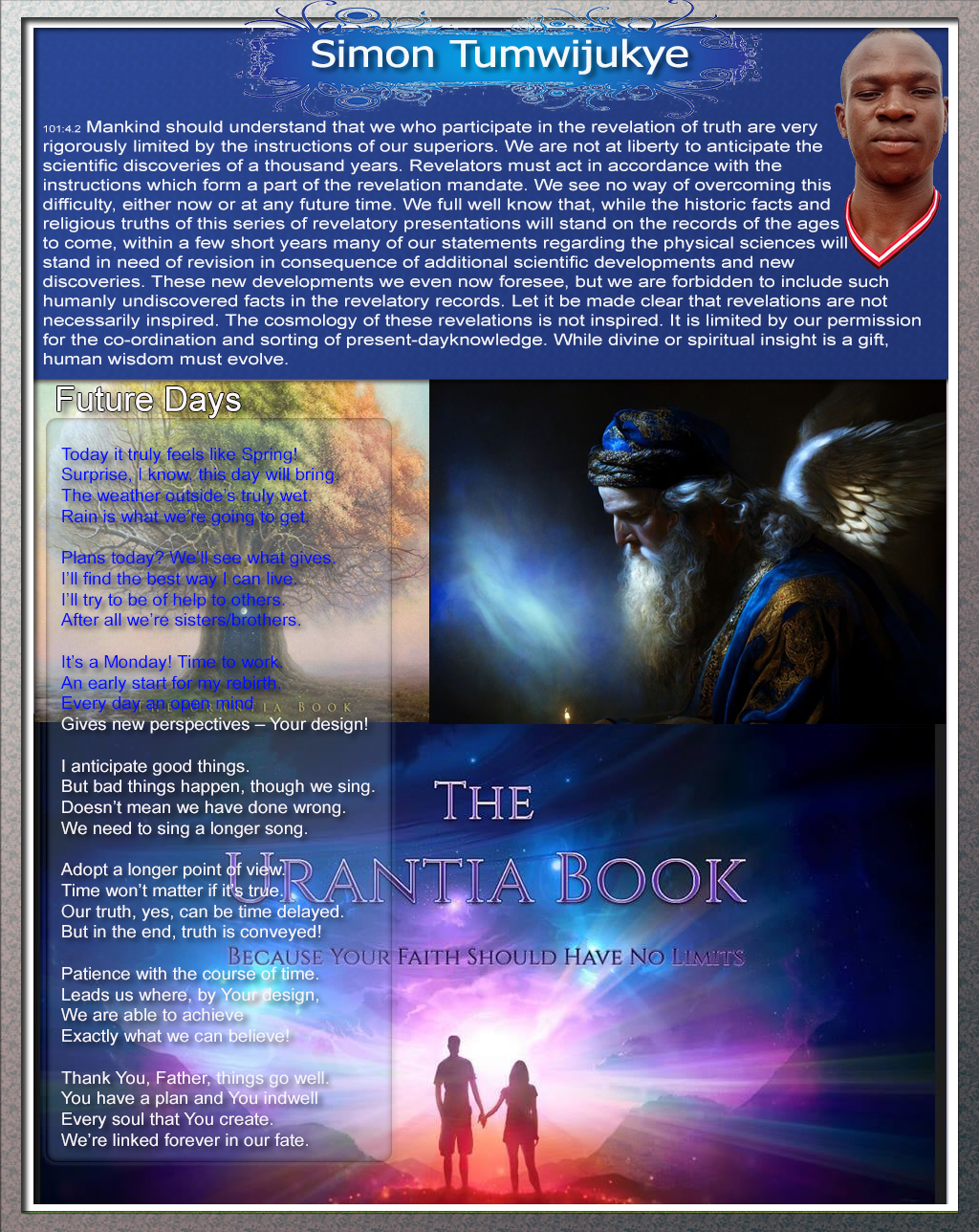 101:4.2 Mankind should understand that we who participate in the revelation of truth are very rigorously limited by the instructions of our superiors. We are not at liberty to anticipate the scientific discoveries of a thousand years. Revelators must act in accordance with the instructions which form a part of the revelation mandate. We see no way of overcoming this difficulty, either now or at any future time. We full well know that, while the historic facts and religious truths of this series of revelatory presentations will stand on the records of the ages to come, within a few short years many of our statements regarding the physical sciences will stand in need of revision in consequence of additional scientific developments and new discoveries. These new developments we even now foresee, but we are forbidden to include such humanly undiscovered facts in the revelatory records. Let it be made clear that revelations are not necessarily inspired. The cosmology of these revelations is not inspired. It is limited by our permission for the co-ordination and sorting of present-dayknowledge. While divine or spiritual insight is a gift, human wisdom must evolve.