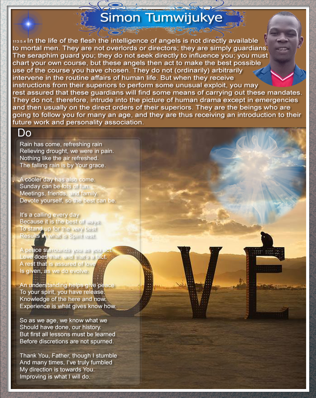 113:5.4 In the life of the flesh the intelligence of angels is not directly available to mortal men. They are not overlords or directors; they are simply guardians. The seraphim guard you; they do not seek directly to influence you; you must chart your own course, but these angels then act to make the best possible use of the course you have chosen. They do not (ordinarily) arbitrarily intervene in the routine affairs of human life. But when they receive instructions from their superiors to perform some unusual exploit, you may rest assured that these guardians will find some means of carrying out these mandates. They do not, therefore, intrude into the picture of human drama except in emergencies and then usually on the direct orders of their superiors. They are the beings who are going to follow you for many an age, and they are thus receiving an introduction to their future work and personality association.
