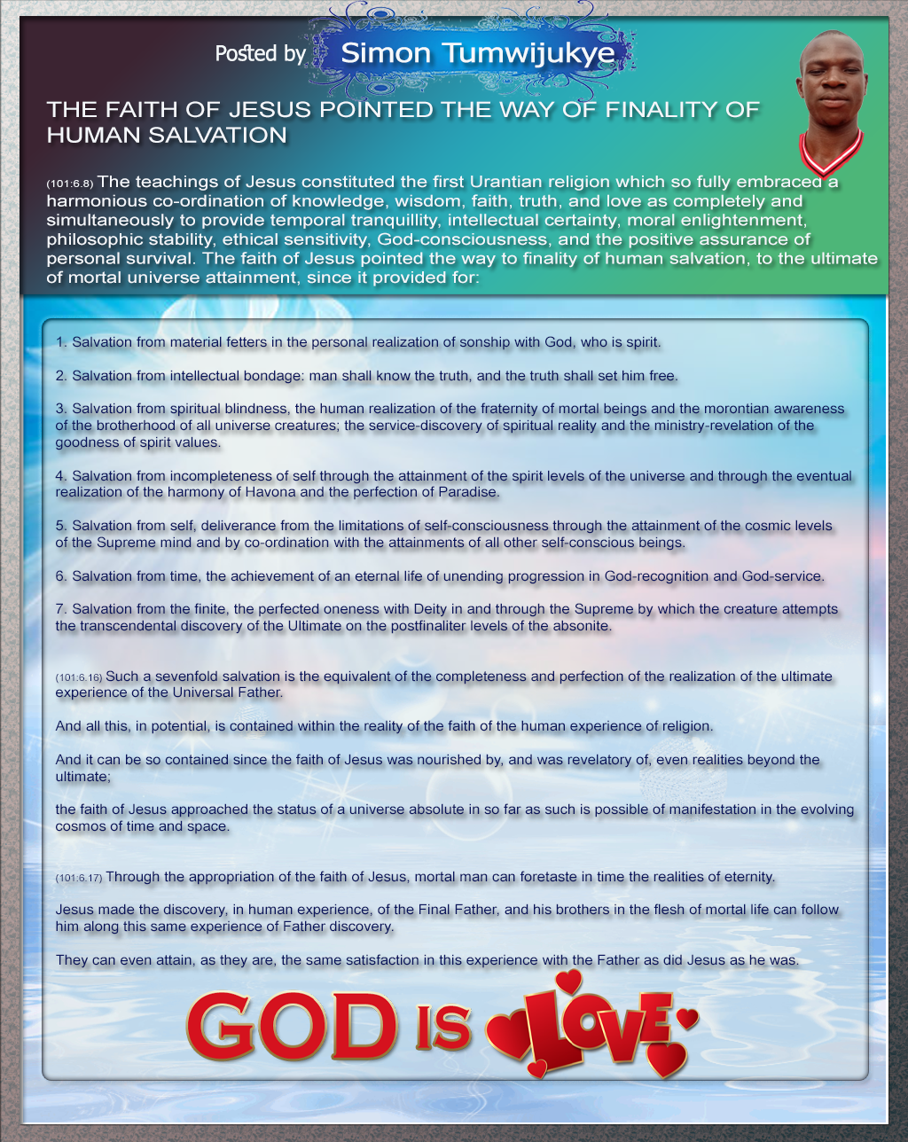 3. Salvation from spiritual blindness, the human realization of the fraternity of mortal beings and the morontian awareness