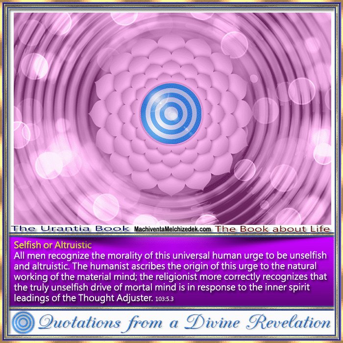 All men recognize the morality of this universal human urge to be unselfish and altruistic. The humanist ascribes the origin of this urge to the natural working of the material mind; the religionist more correctly recognizes that the truly unselfish drive of mortal mind is in response to the inner spirit leadings of the Thought Adjuster. 103:5.3