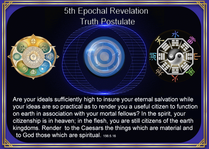 Are your ideals sufficiently high to insure your eternal salvation while your ideas are so practical as to render you a useful citizen to function on earth in association with your mortal fellows? In the spirit, your citizenship is in heaven; in the flesh, you are still citizens of the earth kingdoms. Render to the Caesars the things which are material and to God those which are spiritual. 156:5.16