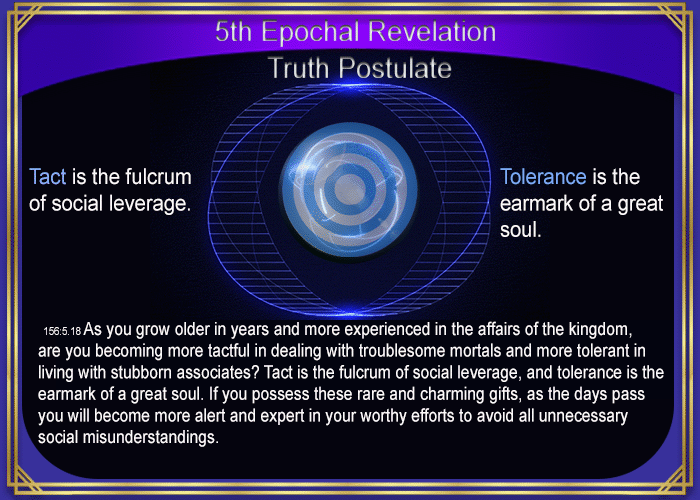 156:5.18 As you grow older in years and more experienced in the affairs of the kingdom, are you becoming more tactful in dealing with troublesome mortals and more tolerant in living with stubborn associates? Tact is the fulcrum of social leverage, and tolerance is the earmark of a great soul. If you possess these rare and charming gifts, as the days pass you will become more alert and expert in your worthy efforts to avoid all unnecessary social misunderstandings.