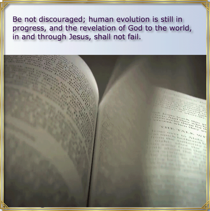 Be not discouraged; human evolution is still in progress, and the revelation of God to the world, in and through Jesus, shall not fail. 196:3.33 | https://mm.spiritualfamily.net/Urantia_Book-Online_Reader-2019/Paper_196.html#196:3.3