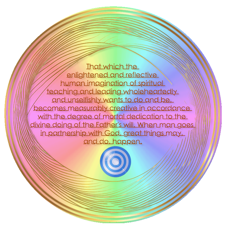 That which the enlightened and reflective human imagination of spiritual teaching and leading wholeheartedly and unselfishly wants to do and be, becomes measurably creative in accordance with the degree of mortal dedication to the divine doing of the Father's will. When man goes in partnership with God, great things may, and do, happen. 132:7.9