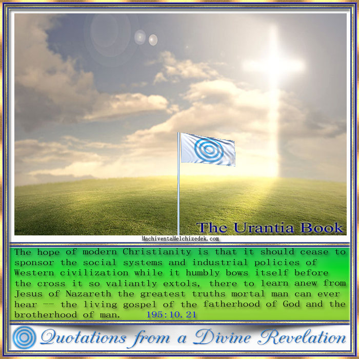 Hope The hope of modern Christianity is that it should cease to sponsor the social systems and industrial policies of Western civilization while it humbly bows itself before the cross it so valiantly extols, there to learn anew from Jesus of Nazareth the greatest truths mortal man can ever hear -- the living gospel of the fatherhood of God and the brotherhood of man. 195:10.21 | https://mm.spiritualfamily.net/Urantia_Book-Online_Reader-2019/Paper_195.html#195:10.21