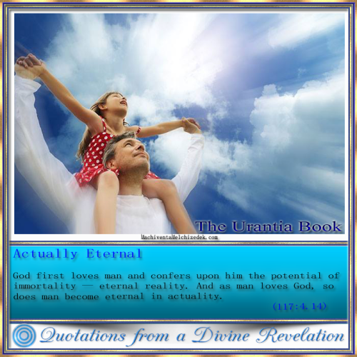 God first loves man and confers upon him the potential of immortality — eternal reality. And as man loves God, so does man become eternal in actuality. 117:4.14 | https://mm.spiritualfamily.net/Urantia_Book-Online_Reader-2019/Paper_117.html#117:4.14